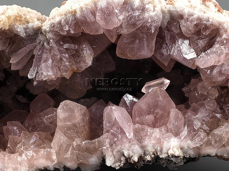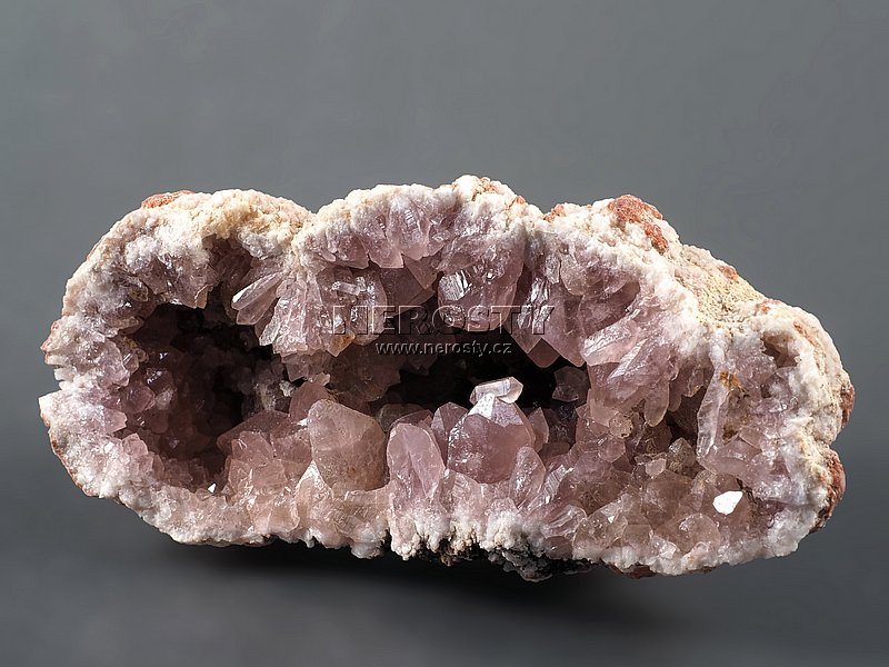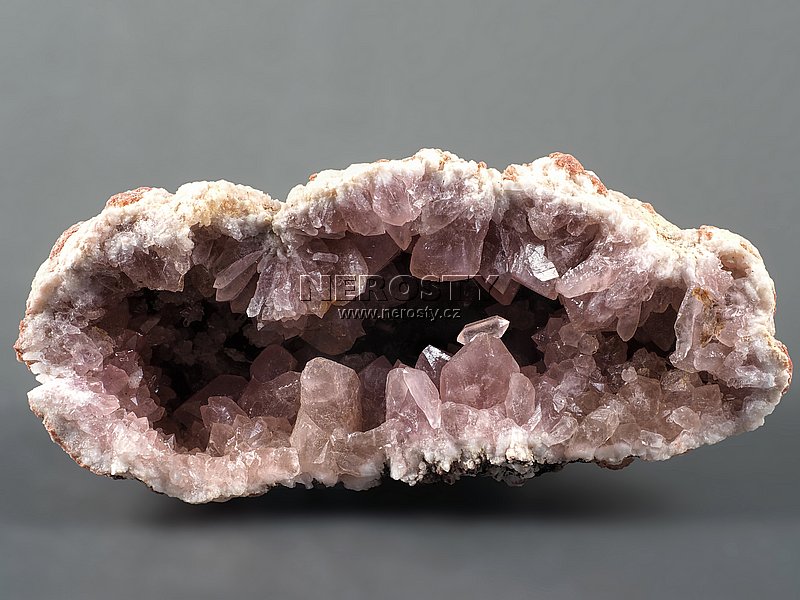 Geoda z obecného křemene vyplněná krystaly růžového ametystu.