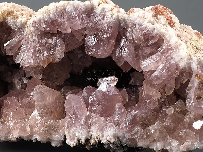 Vnitřek zploštělé geody je zcela vyplněn nestejnoměrně velkými a různě probarvenými krystaly růžového ametystu který zdánlivě připomíná růženín. Velikost lesklých průsvitných krystalů nepřesahuje 15 mm.