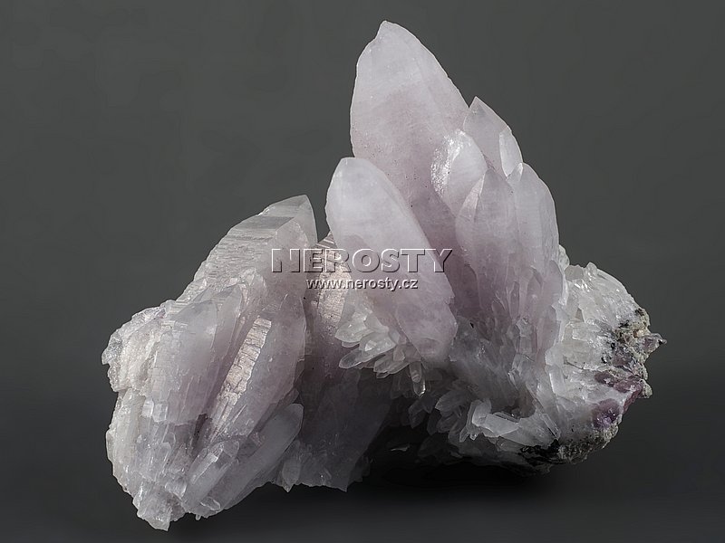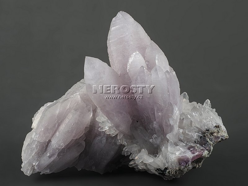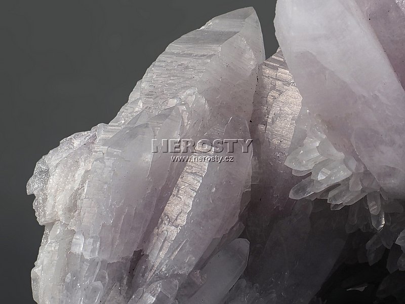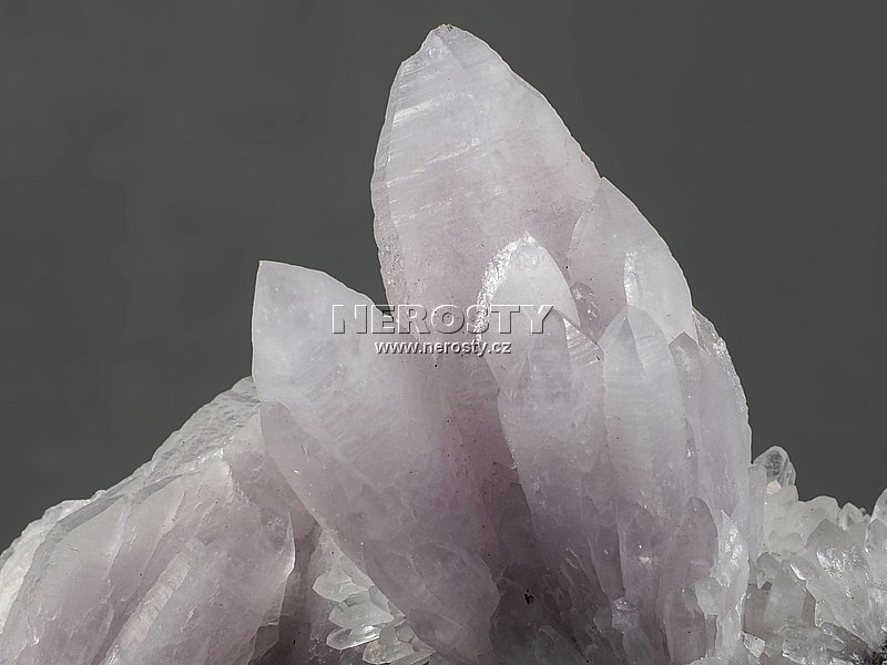 Zbarvení krystalů přechází od téměř čirých zón na špičce až po tmavě fialové odstíny uvnitř báze krystalu. Vnitřní temně fialový krystal ametystu je potažený přibližně 2 mm silnou vrstvou mléčně bílého křemene. Krystaly jsou sklovité, robustní s ostrými pyramidovými hroty a silným leskem. Délka největšího z nich s drobným poškozením u špice je zhruba 6 cm.