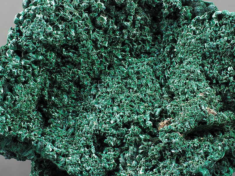 Oboustranný vzorek, tvořený hustě srostlými vějířky malachitových krystalů.