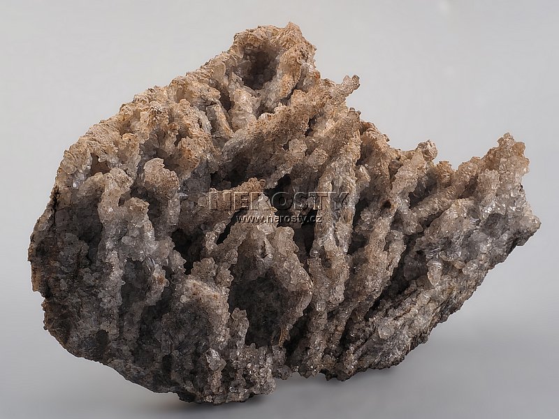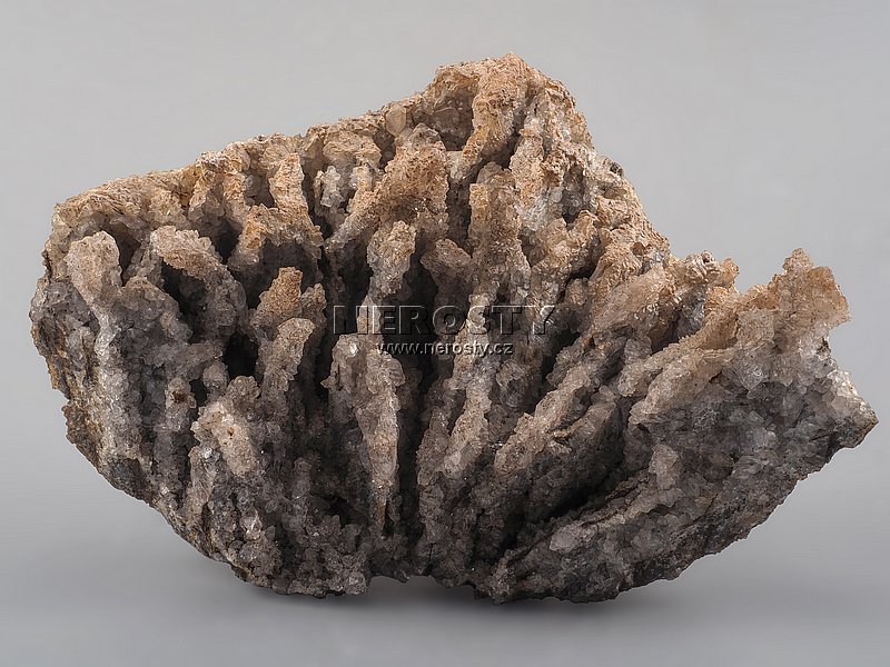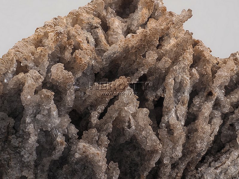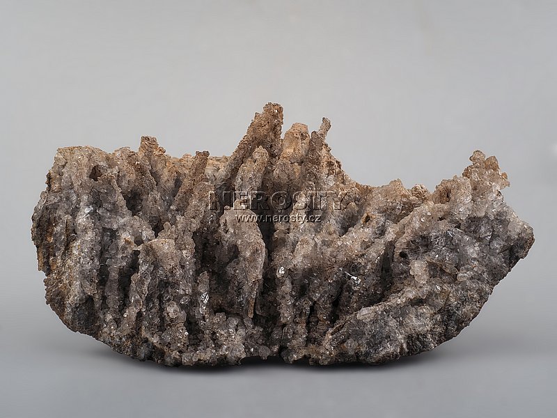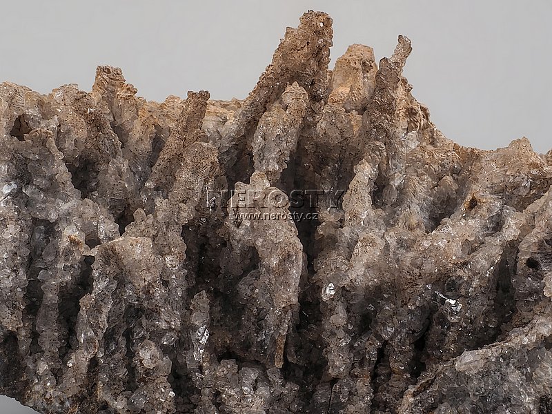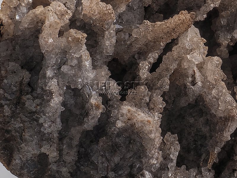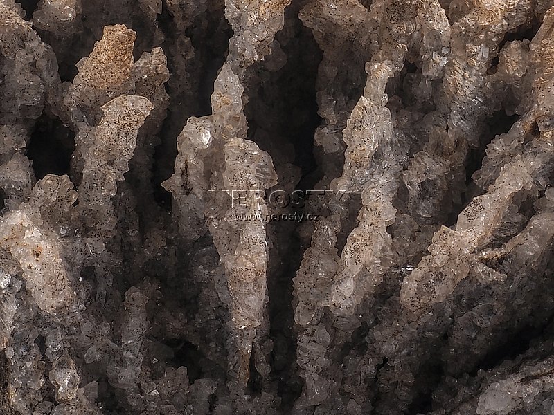 Na tenké podložce jsou šikmo narostlé dlouhé krápníčky složené z drobných krystalů křemene.