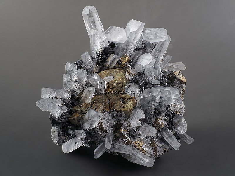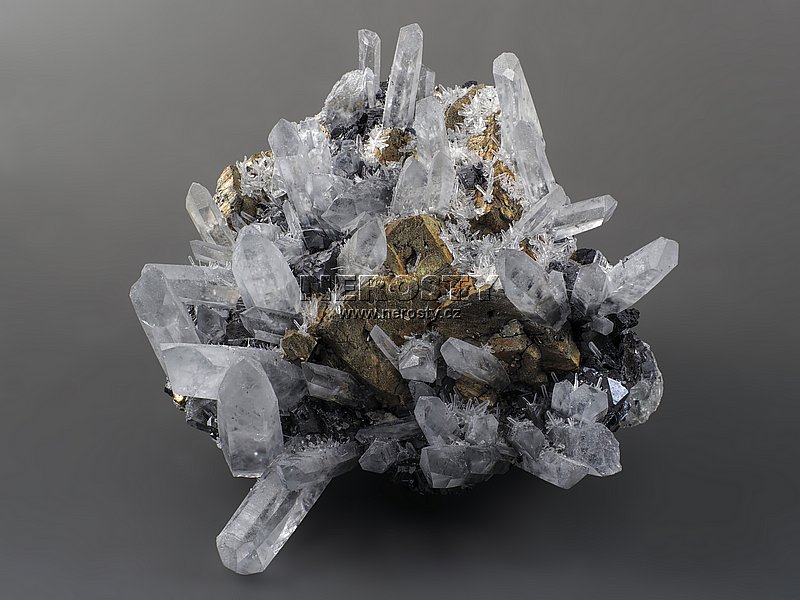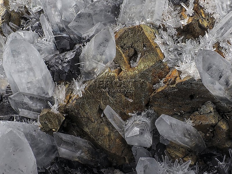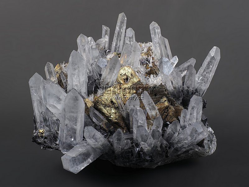Velké krystaly zlatého chalkopyritu s křišťálem.